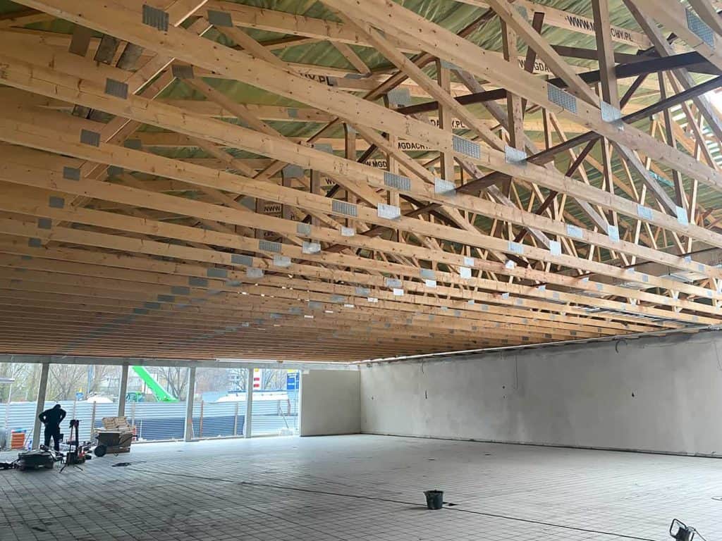Poniżej prezentujemy relację z montażu wiązarów MGDachy na budynku handlowym sieci Netto.